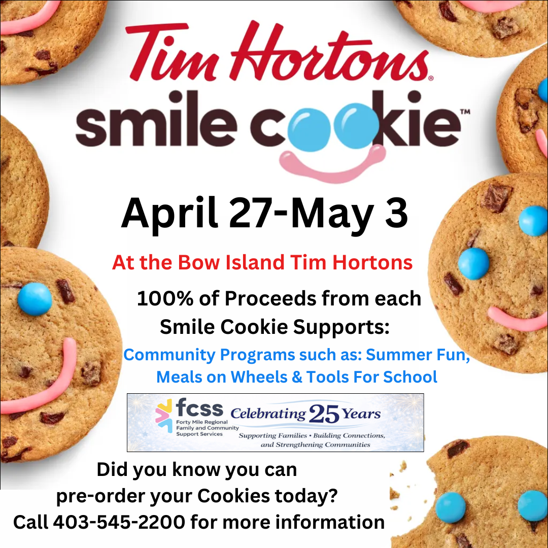 What: Smile Cookies are back! Any Smile Cookies purchased will help out FCSS and their programs, including Meals on Wheels, Tools for Schools, etc. To ensure you’re able to get your hands on some Smile Cookies, please fill out a pre-order form, available at the FCSS or Community Resource Centre office.